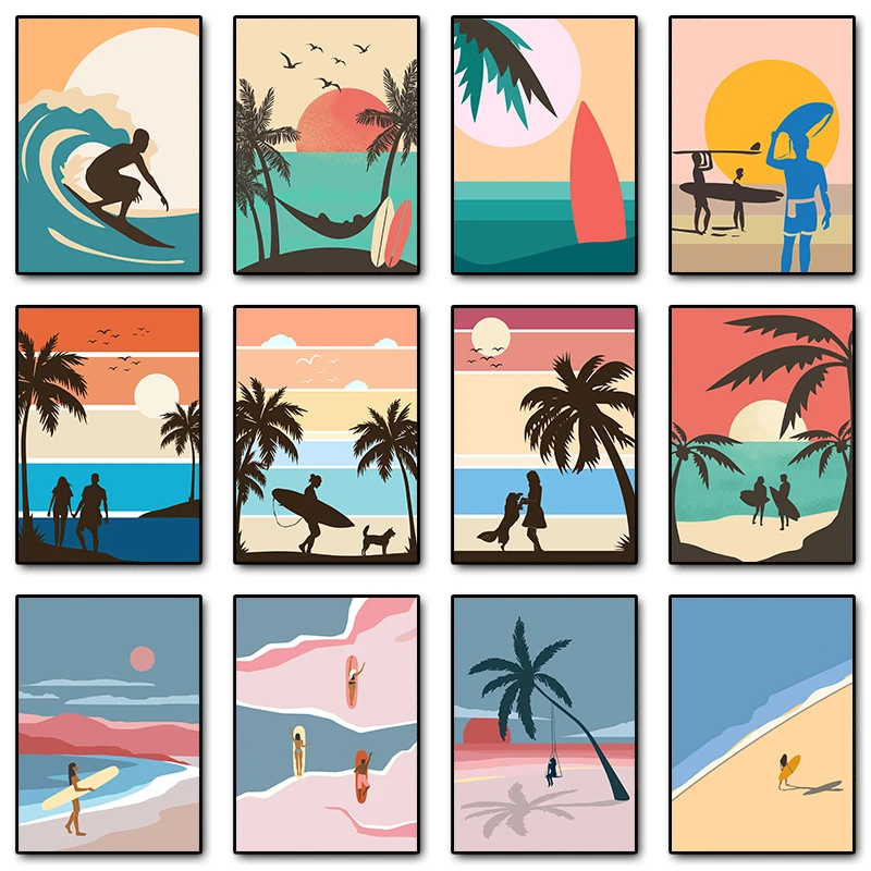 해변 바다 파도 다리 밴 코코넛 나무 서핑 보드, 자동차 벽 아트 캔버스 페인팅, 북유럽 포스터 인쇄 그림, 거실 홈 데코